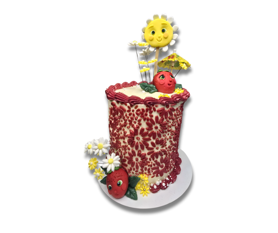 Bring a little sunshine to the party! Our Sunshine Garden Cake is a hand-decorated celebration of warm days, fresh berries and happy vibes. With smiling fondant sun, cute strawberry characters, tiny daisies and a floral buttercream pattern wrapped all the way around, it’s a true show-stopper from every angle.