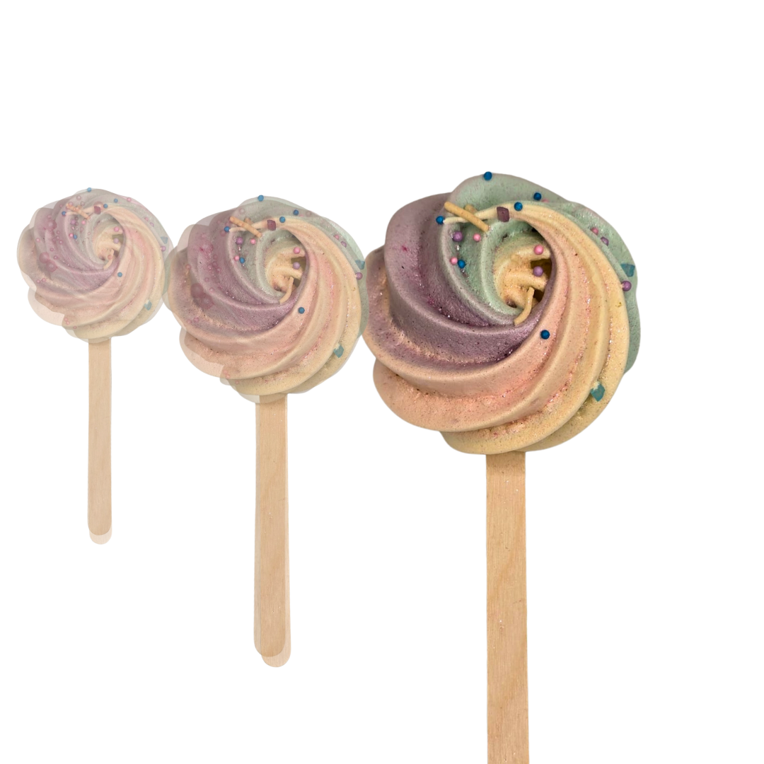 These playful pastel meringue lollipops are light, crispy, and melt beautifully in your mouth. Each one is handcrafted with soft swirls of colour and sprinkled with charming little decorations, making them just as lovely to look at as they are to eat.