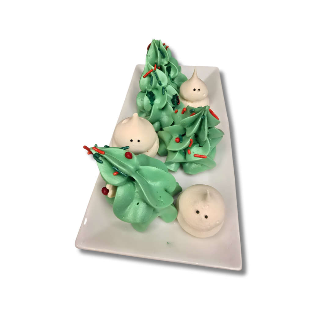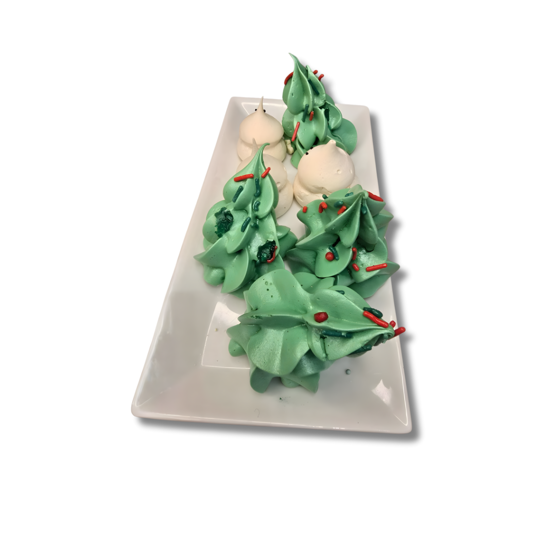 Light, crisp and melt-in-your-mouth – our Xmas Tree with Snowman Meringues are the cutest little festive treat. Swirls of pastel-green meringue are piped into Christmas trees, sprinkled with “baubles”, and paired with adorable white snowmen faces.