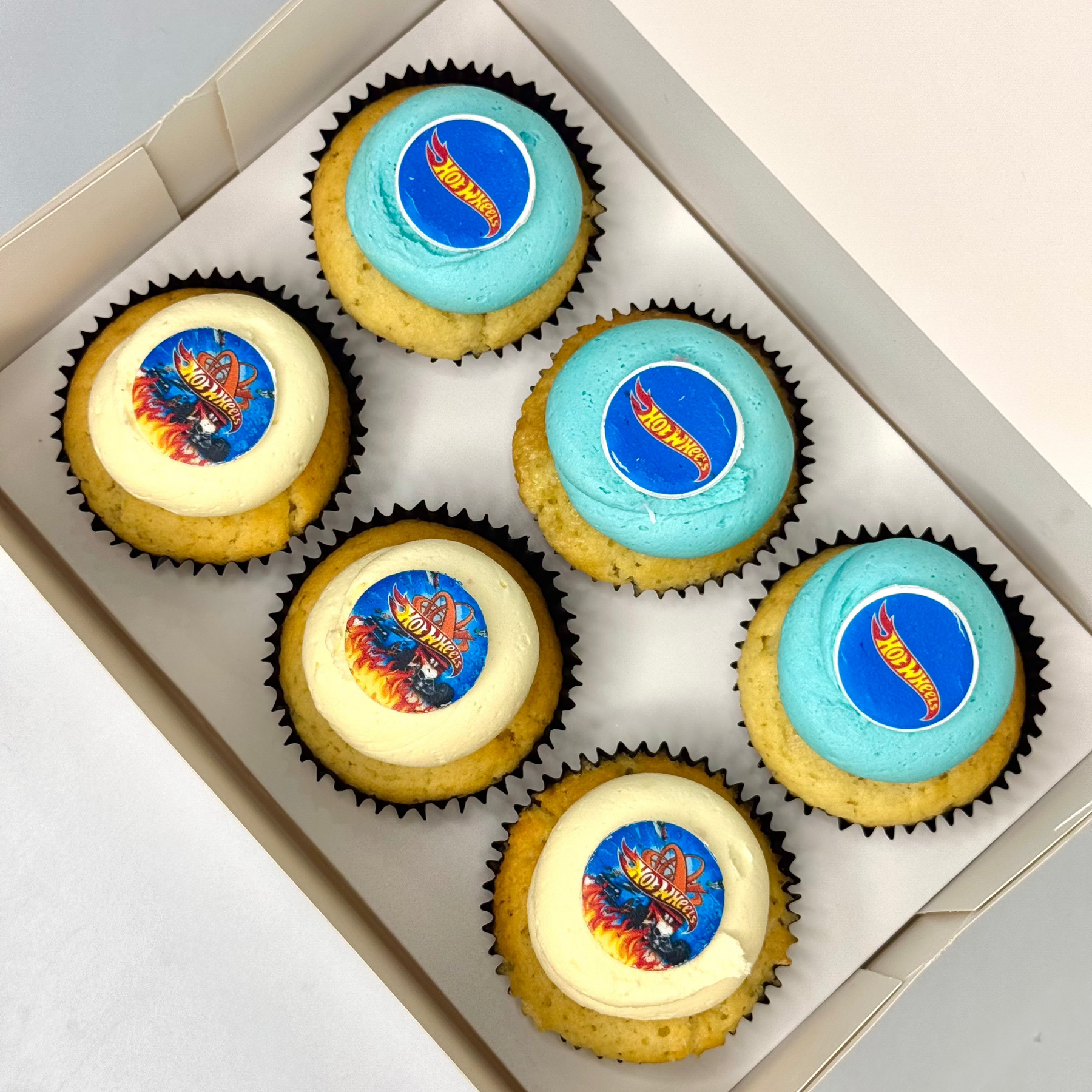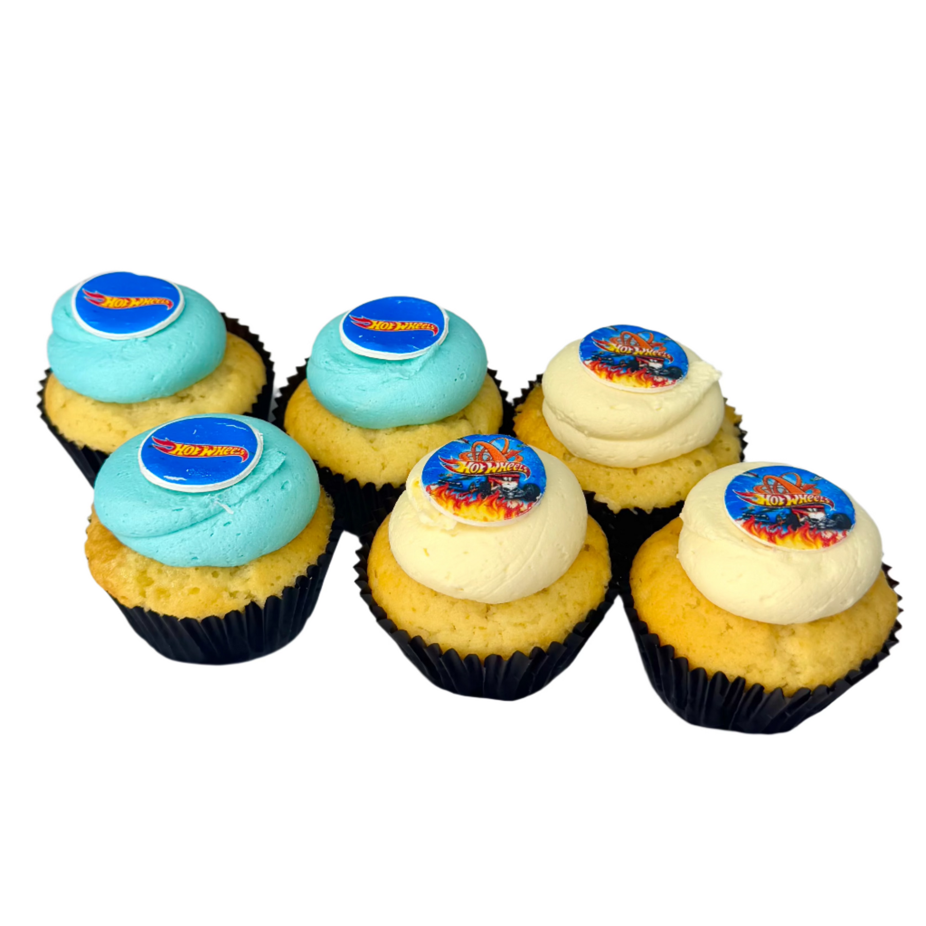 Start your engines with our Hot Wheels Cupcakes! These race-ready treats feature a moist base of your choice, topped with bold swirls of blue and white vanilla ganache, and finished with a signature Hot Wheels token for that turbo-charged finishing touch.
