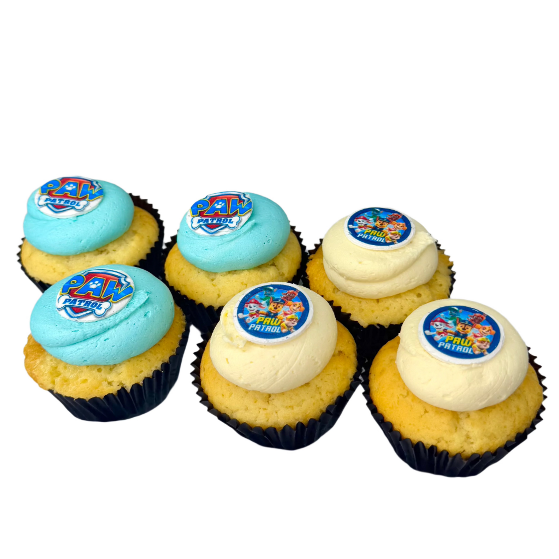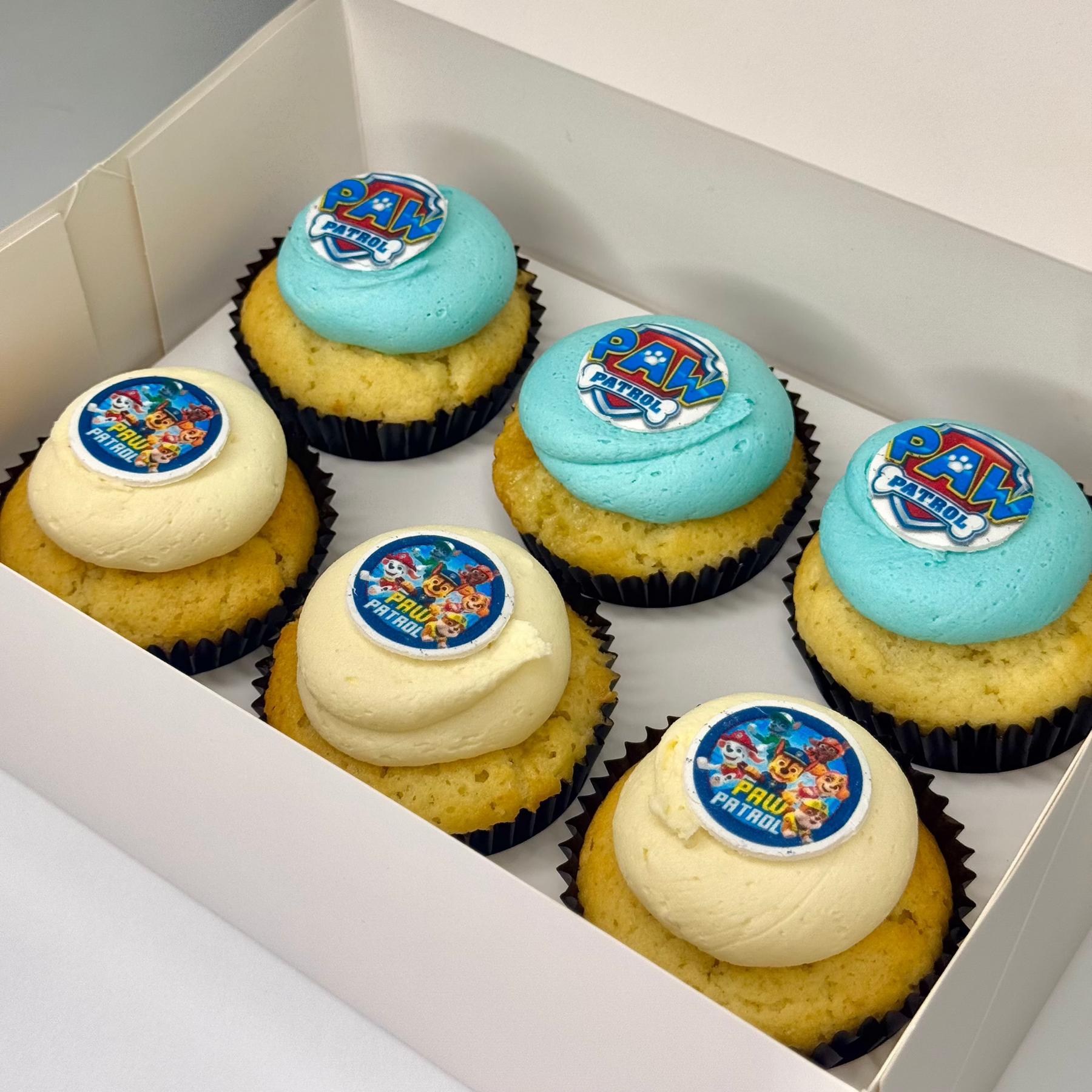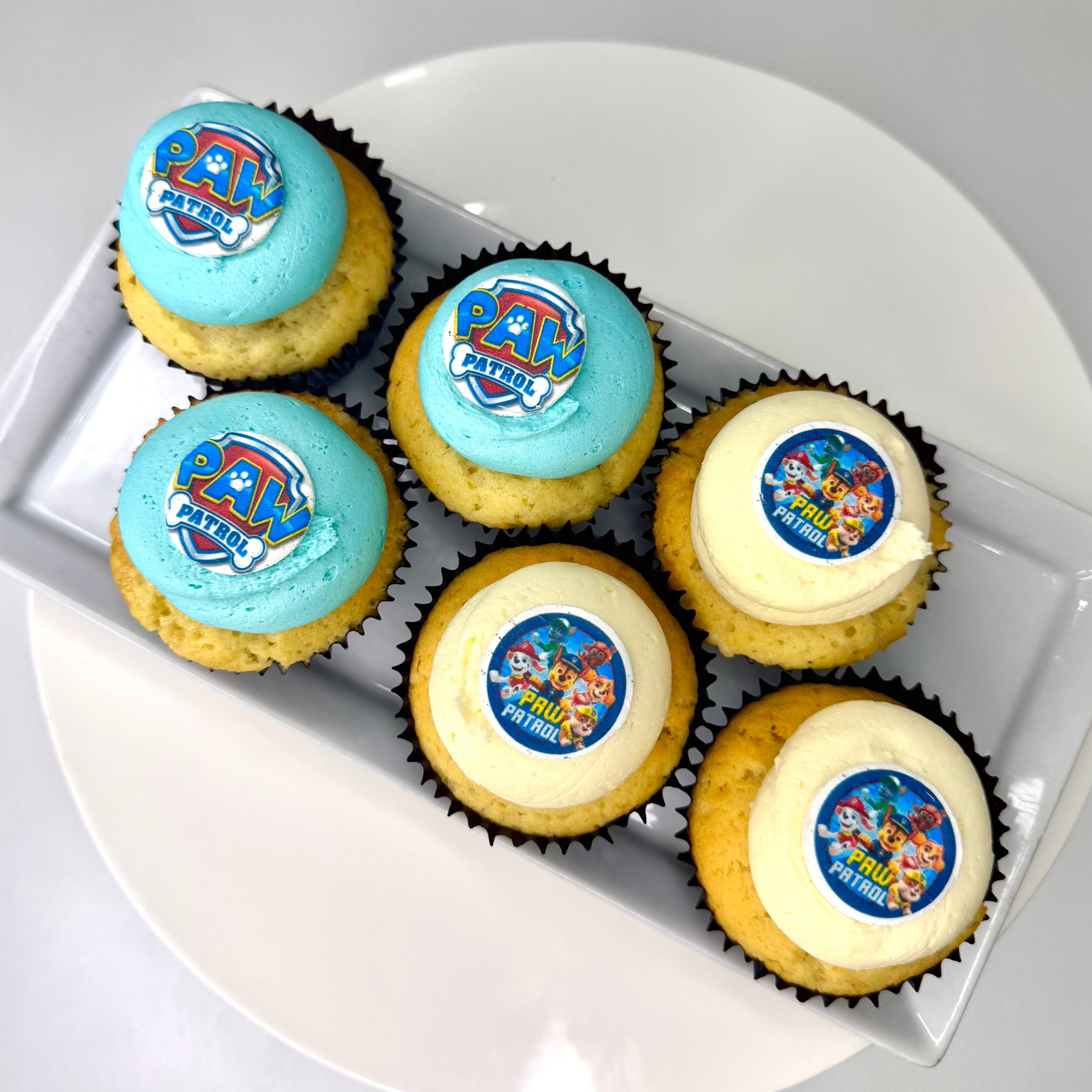Get ready for a treat that’s paw-sitively awesome with our Paw Patrol Cupcakes! They feature a moist base of your choice, topped with playful swirls of blue and white vanilla ganache, and finished with a signature Paw Patrol token.