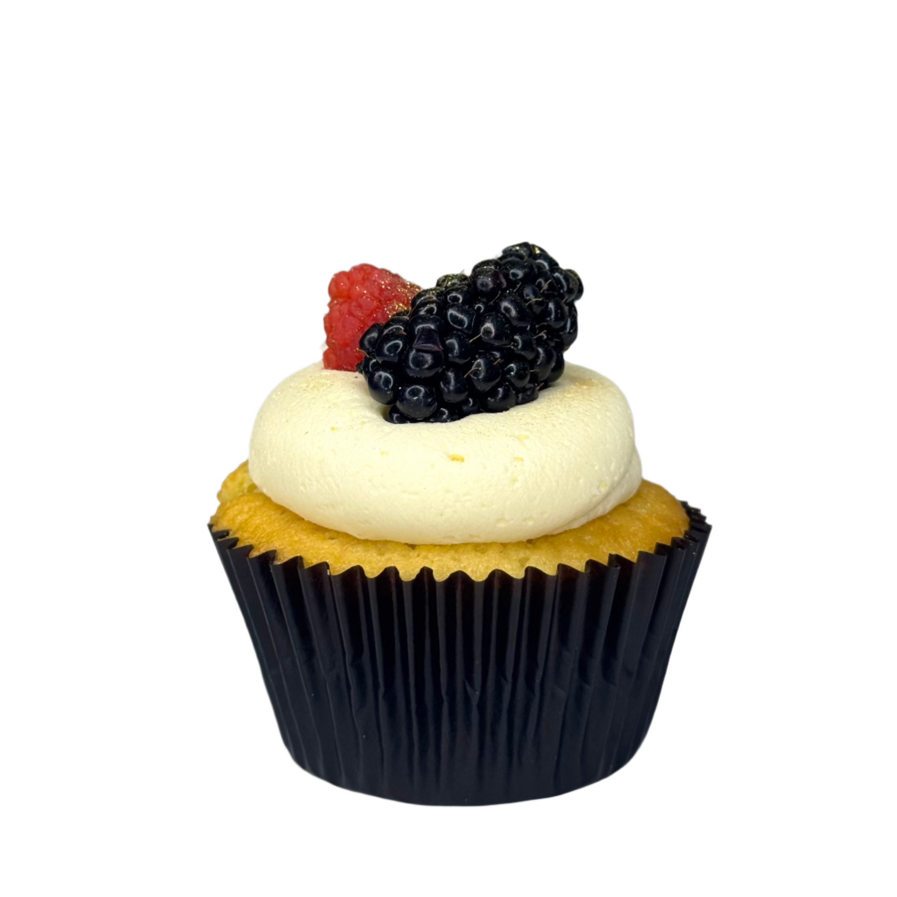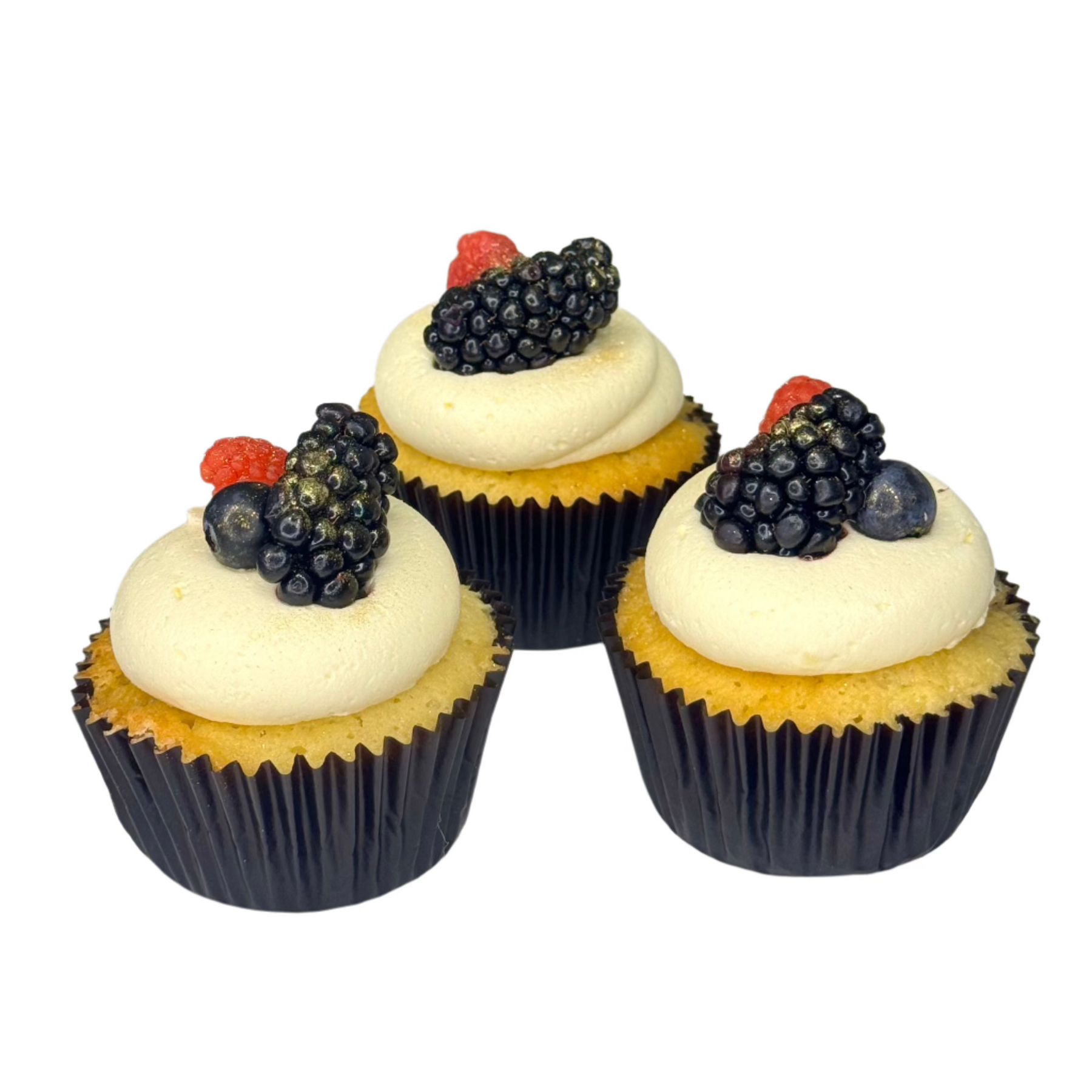 Our Mixed Berries Cupcake features a soft vanilla sponge bursting with juicy berries, topped with smooth vanilla buttercream and crowned with a mix of fresh berries and a delicate gold shimmer.