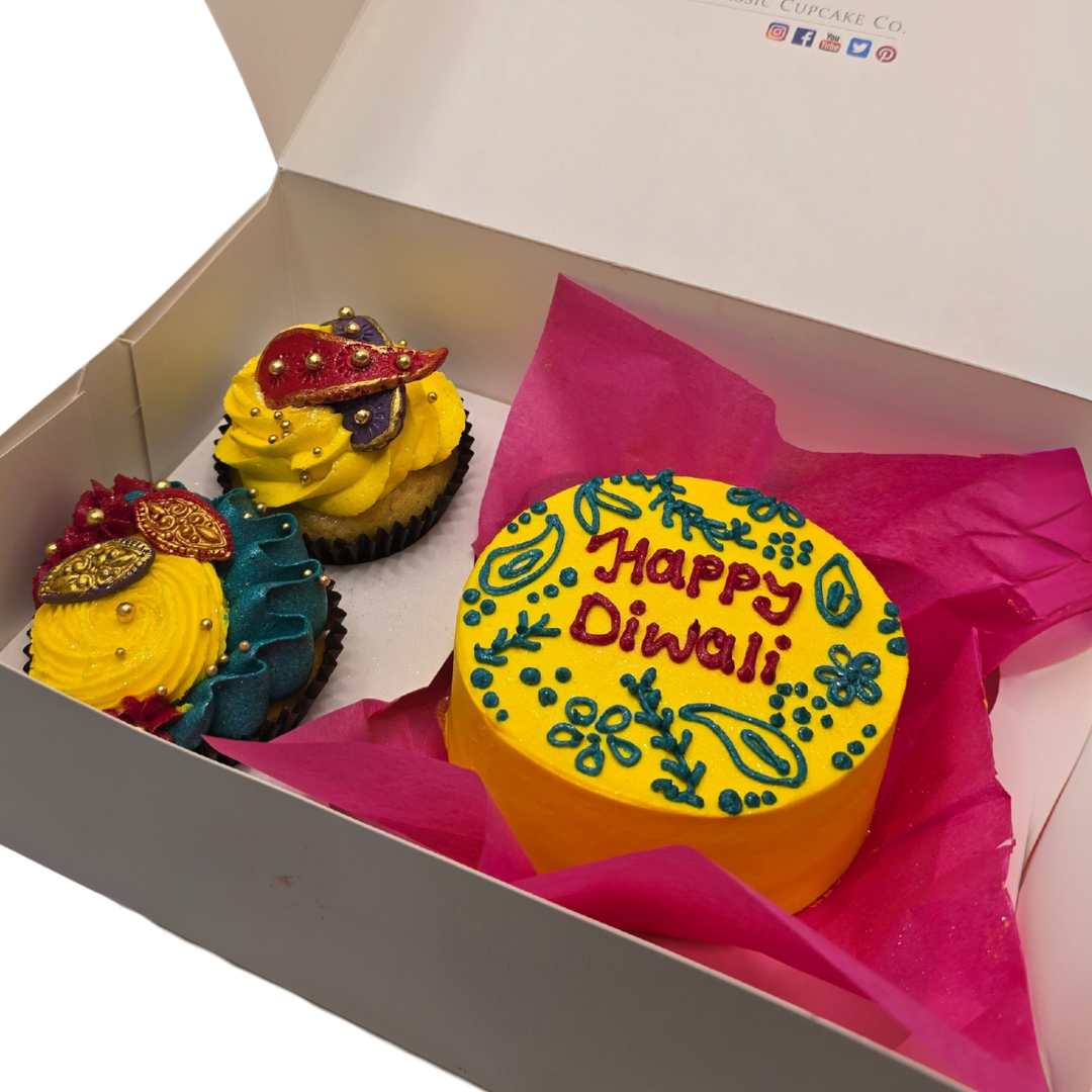 Celebrate the Festival of Lights with double the joy! Our Diwali Duo-Box features a handcrafted mini Diwali Cake and two beautifully decorated Diwali-themed cupcakes, all nestled in a luxury gift box with vibrant festive colours.