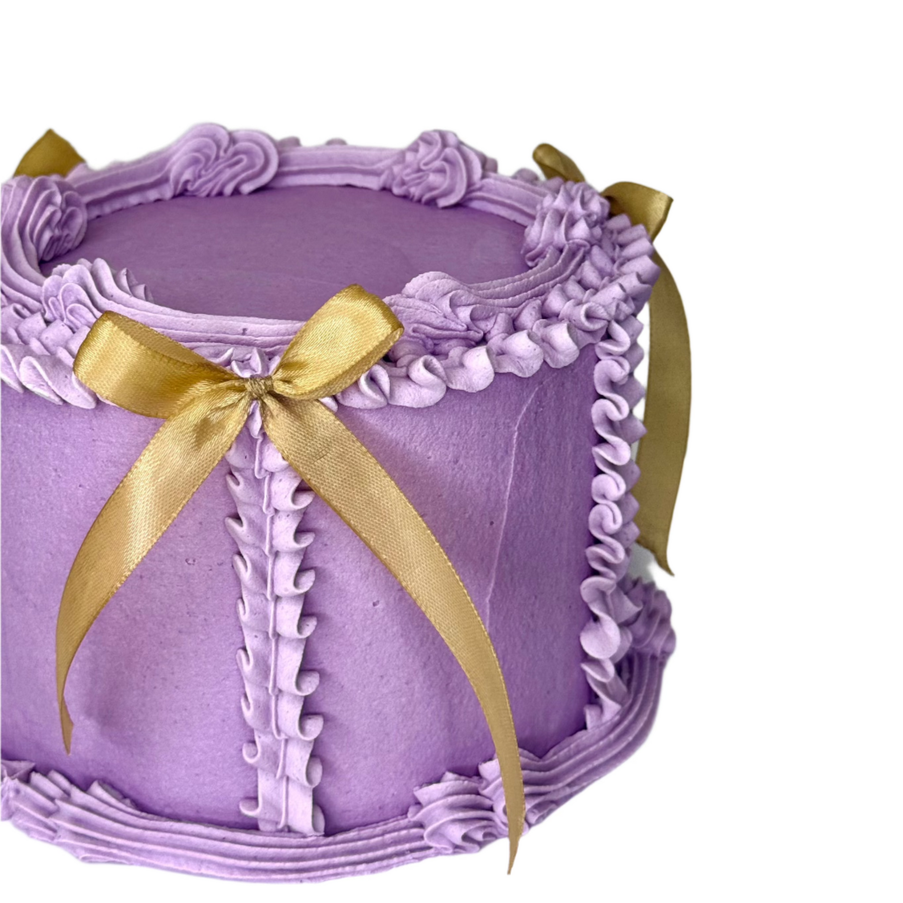 A timeless beauty that channels vintage charm with a modern twist. This stunning cake features rich shades of purple, accented by hand-piped icing details and adorned with elegant gold bows.