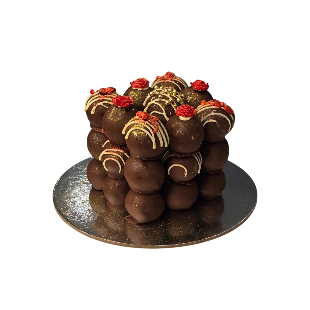 Elevate your celebration with the Bubble Bloom Bash—a stunning, sculptural cake that blends elegance and playfulness in every bite. This eye-catching design features a vibrant arrangement of edible cake spheres in shades of blush pink, romantic red, creamy ivory, deep emerald, and also a chocolate, all accented with touches of gold leaf and delicate floral décor. Finished with a sleek gold candle-style topper, this cake is the perfect showpiece for birthdays, luxury events, or anyone who adores bold beauty with a modern twist.