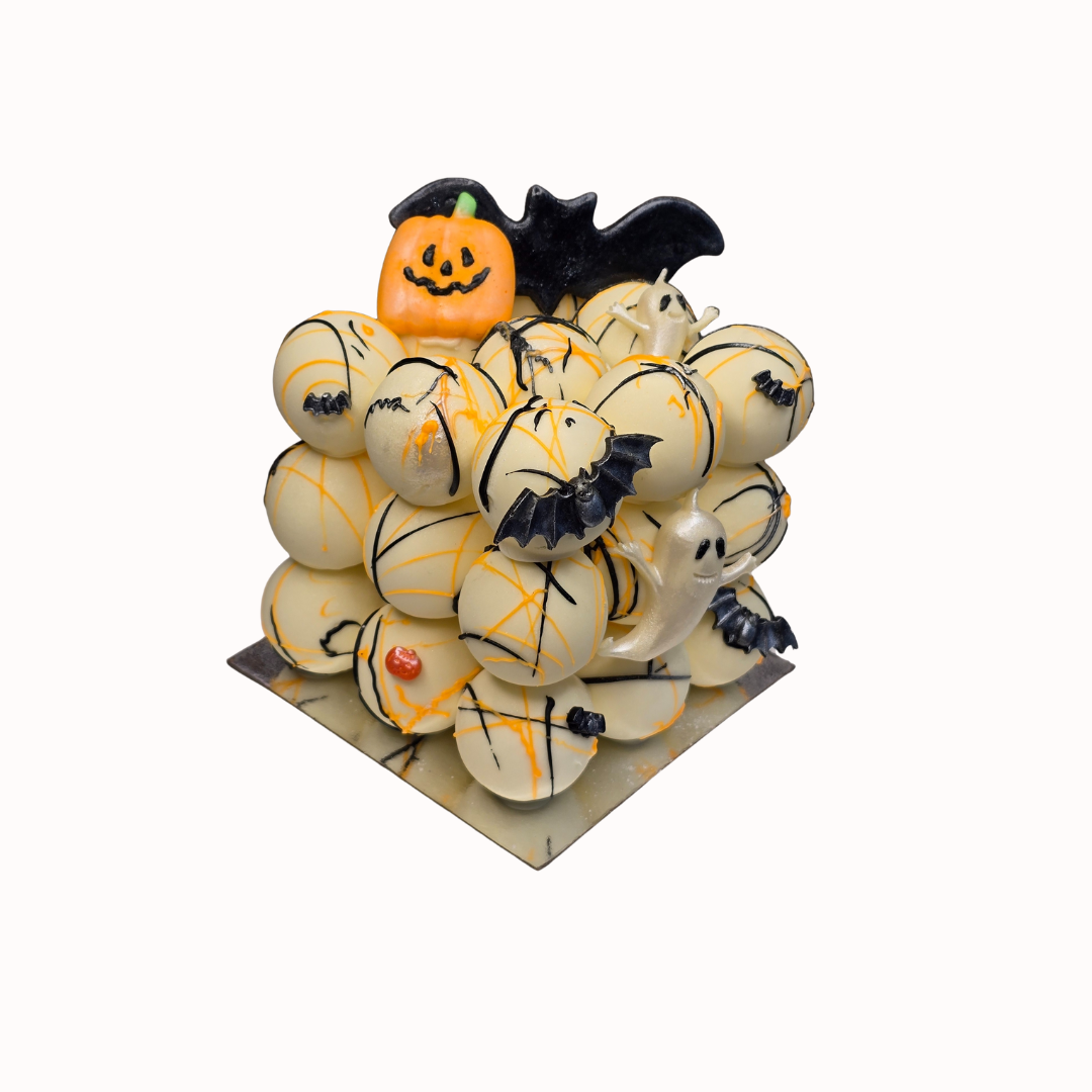 Introducing our Halloween Cakepop Cake — a terrifyingly tasty tower of bite-sized fun! Made entirely of moist, hand-dipped cake pops coated in creamy white chocolate and decorated with spooky details like edible bats, ghosts, pumpkins, and drizzle, this cake is a Halloween game-changer.