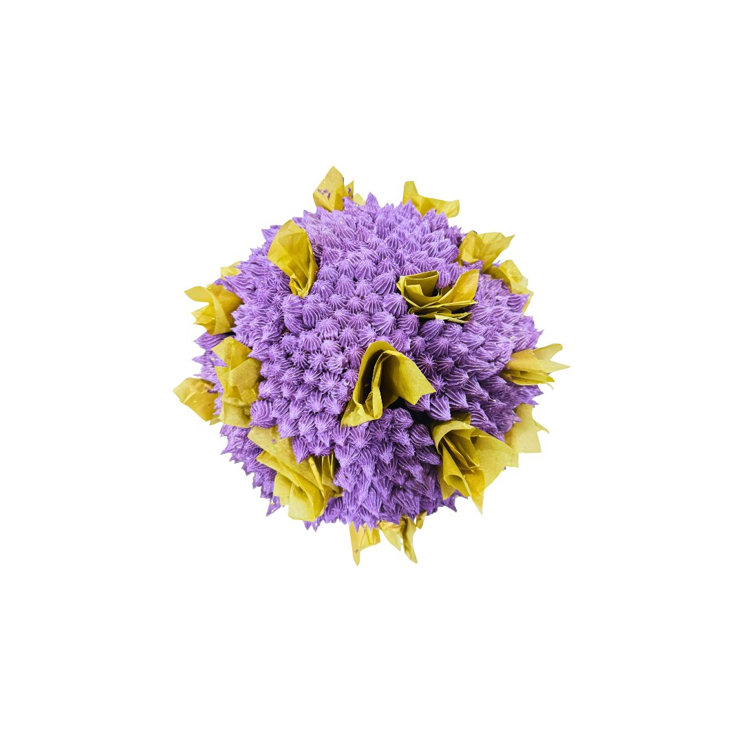 Our Purple Succulents Bouquet is a gorgeous illusion – it looks like a lush pot of succulents, but every “petal” is silky buttercream piped onto hidden cupcakes. Shades of soft purple, textured like real succulents and nestled in a gold pot, make this the perfect edible gift.