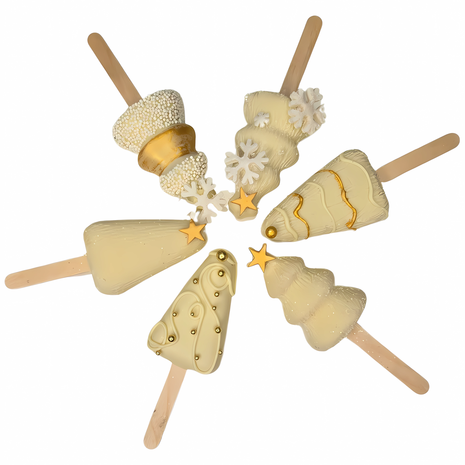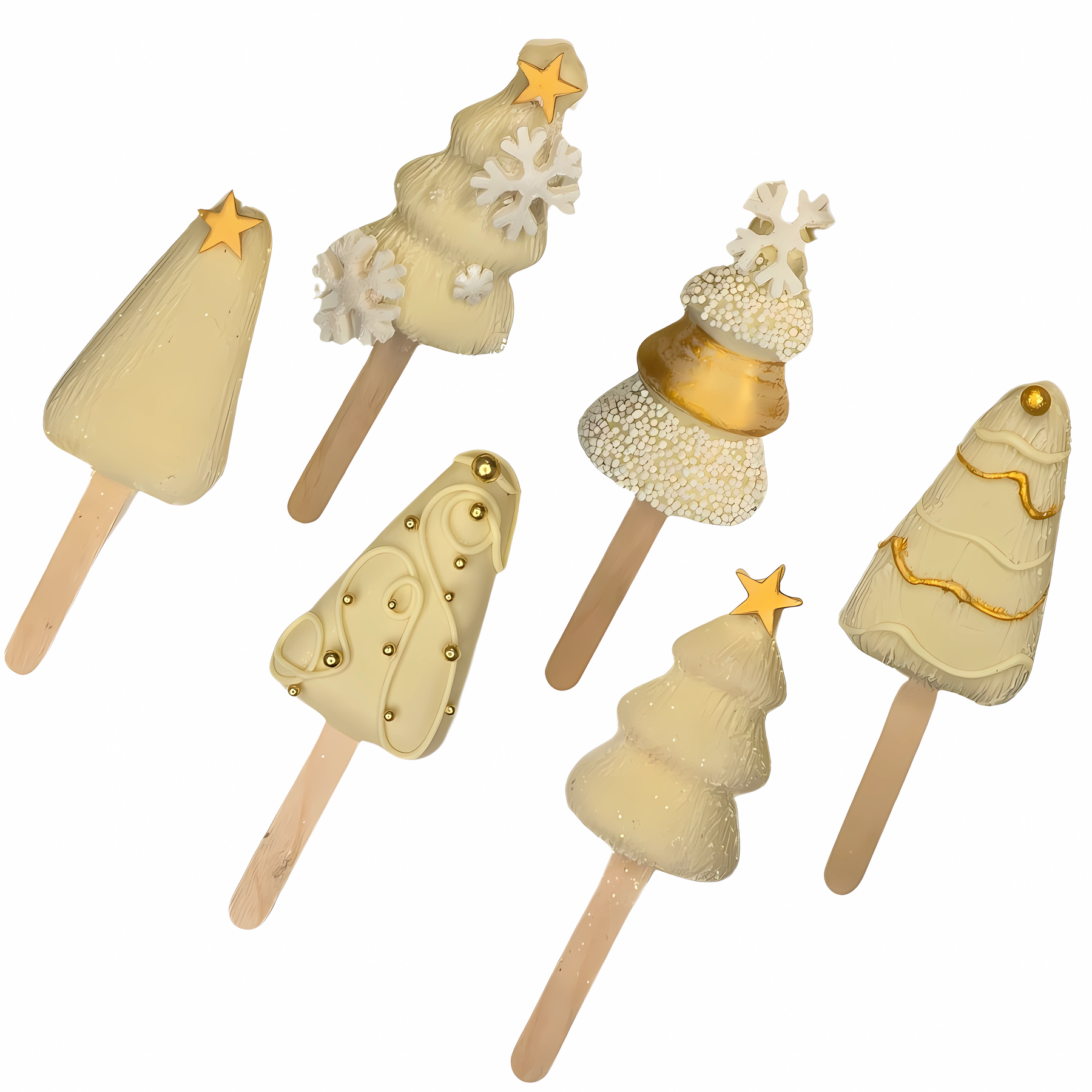 Bring the festive spirit of Christmas in July to life with our delightful Christmas in July Cakepops. Each one is hand-decorated in elegant white and gold, shaped into charming little Christmas trees and topped with pretty stars, snowflakes, or swirls of golden details.