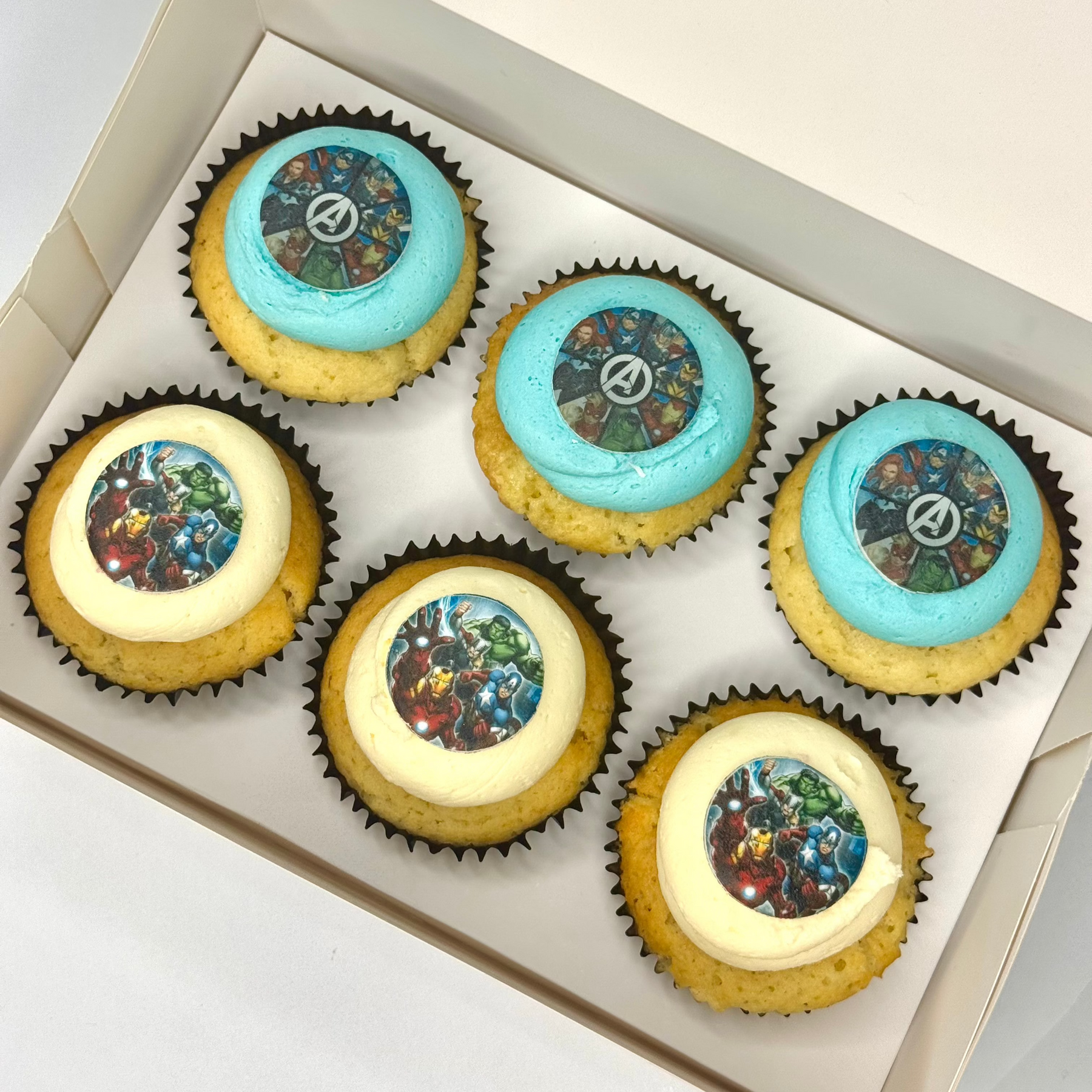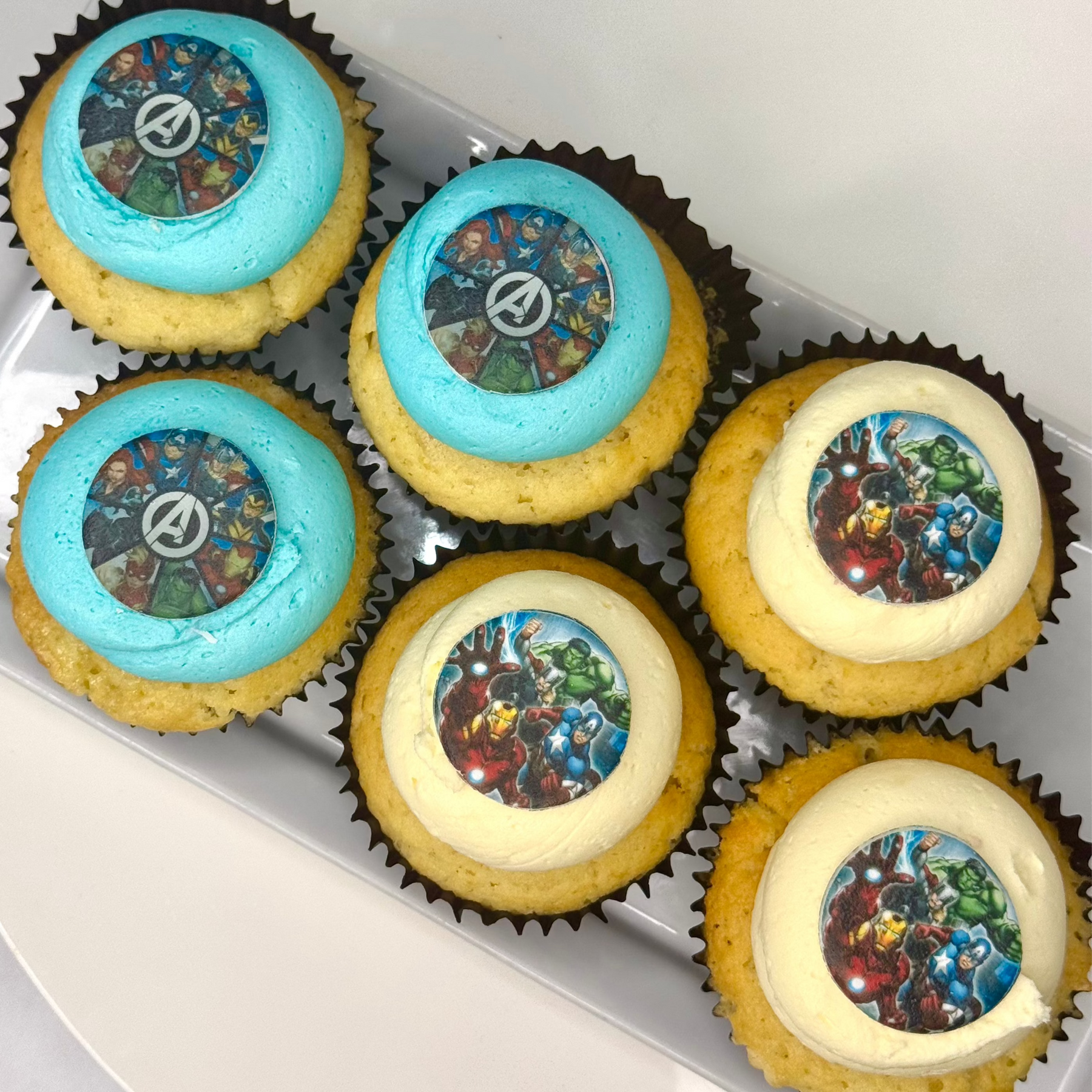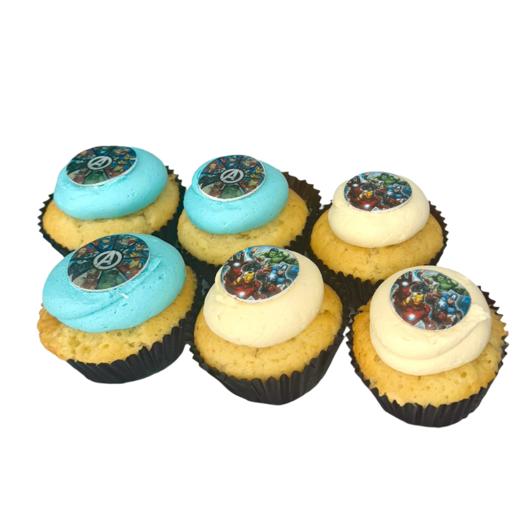 Suit up for action with our Avengers Cupcakes! These super-powered treats feature a moist base of your choice, topped with dynamic swirls of blue and white vanilla ganache, and finished with a signature Avengers token for that epic final touch.
