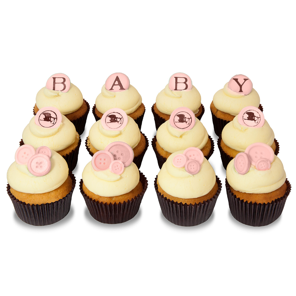 Each box comprises of Classic cupcakes (12), Stork fondant tokens (4), BABY tokens (4) & Belgian chocolate button collections.