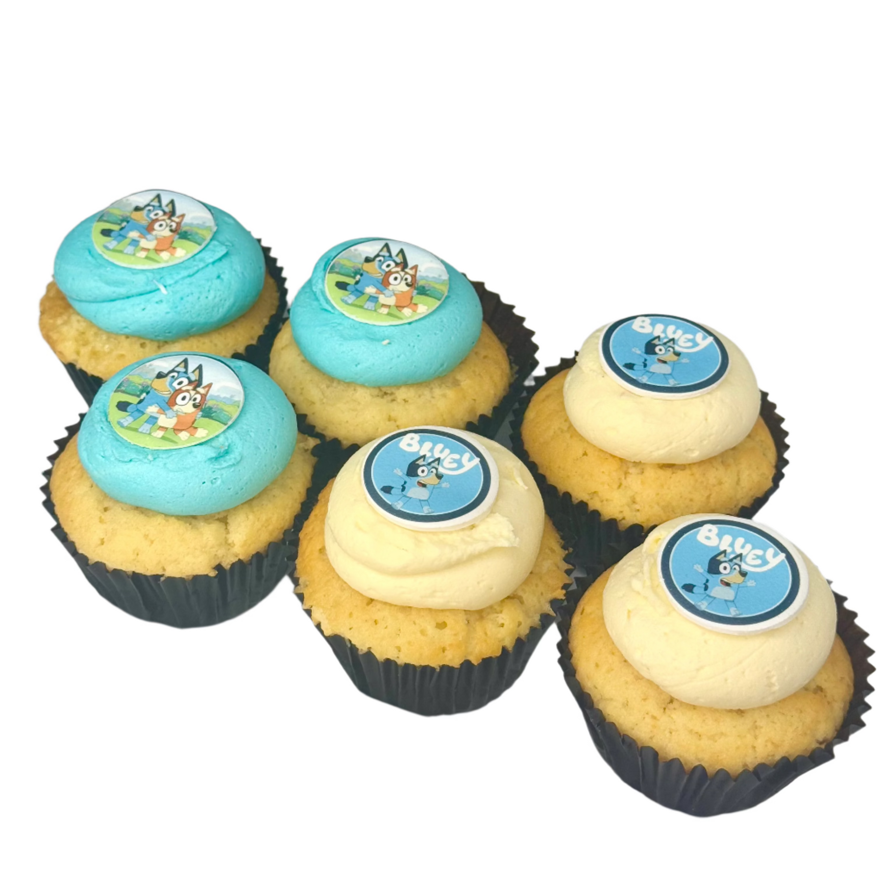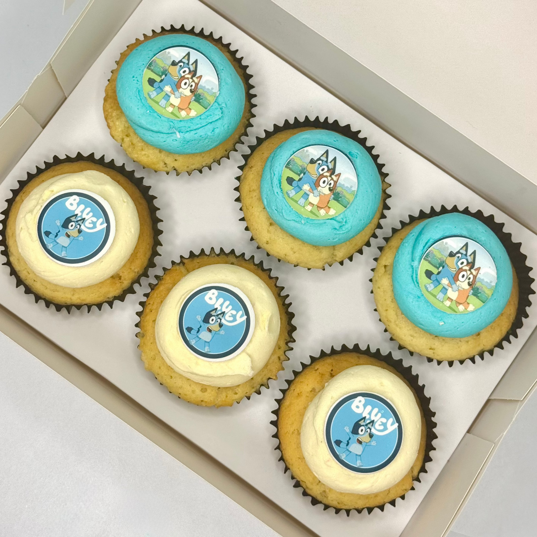 Bring the fun of Bluey to life with our Bluey Cupcakes! These joyful treats feature a moist base of your choice, topped with playful swirls of blue and white vanilla ganache, and finished with a signature Bluey token for that extra bit of Aussie charm.