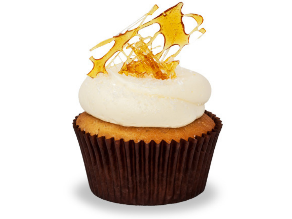 A fresh banana sponge with a rich caramel filling & topped with a light white buttercream & hard toffee piece.