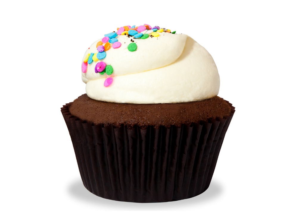 Belgian Callebaut chocolate cupcake topped with whipped buttercream and multi-coloured pastel confetti sprinkles.