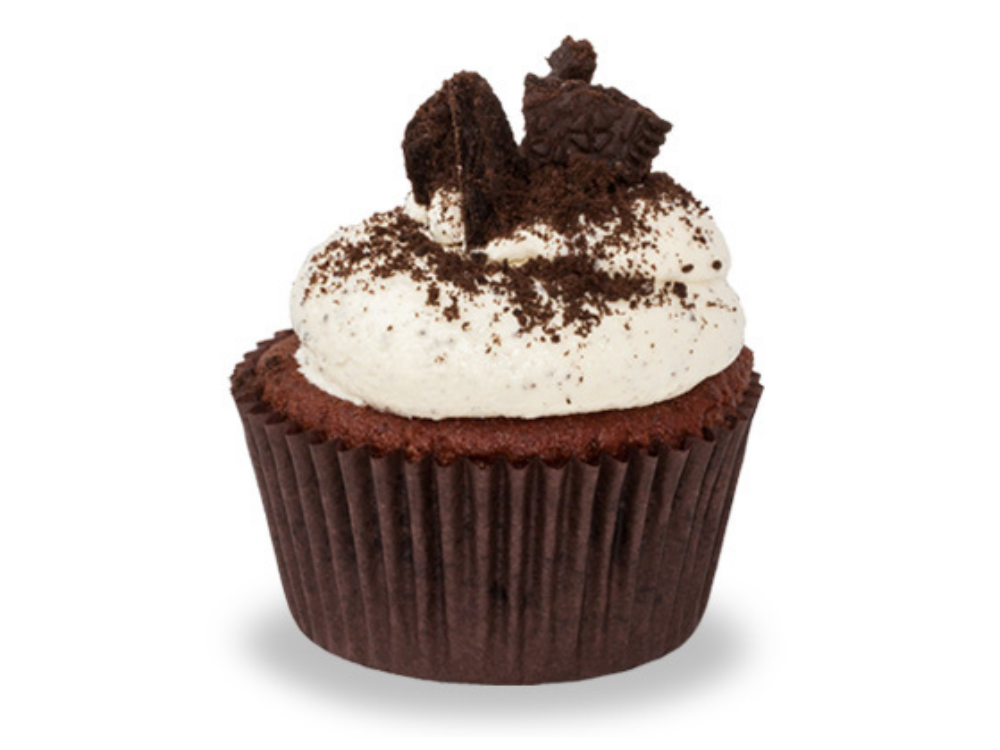 Belgian white & dark Callebaut chocolate cupcake topped with Oreo crumble-infused buttercream frosting & cookie pieces.