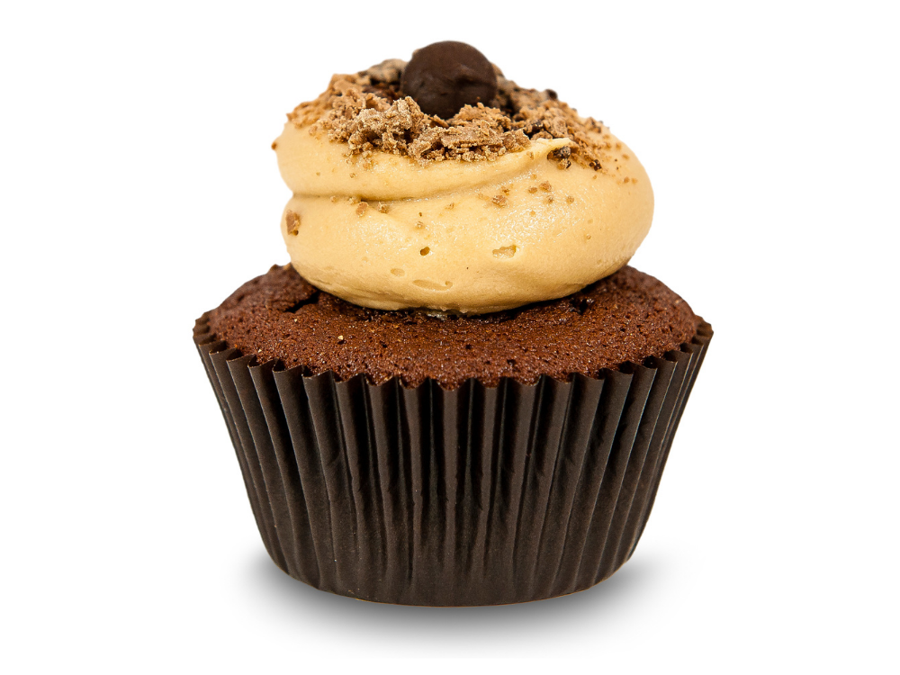 Belgian dark Callebaut cupcake topped with light chocolate buttercream, chocolate flakes and a Callebaut chip.