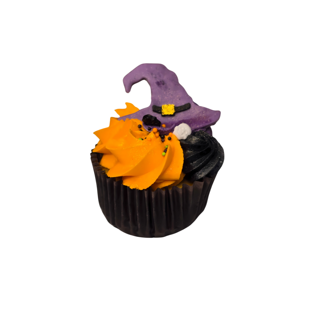 Our handcrafted Halloween Witch Cupcake is the perfect bite-sized enchantment for spooky season! Swirled with vibrant orange and black buttercream, topped with an adorable edible witch hat, and finished with Halloween sprinkles — it’s scary how good this tastes.