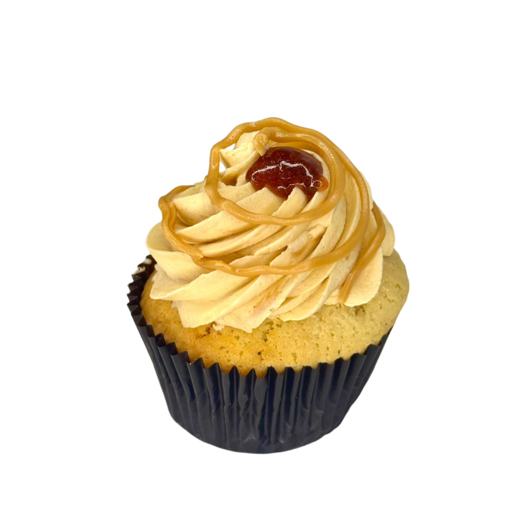 These deliciously moist cupcakes feature a rich peanut butter sponge filled with a sweet strawberry jelly centre, topped with creamy peanut butter frosting and a playful swirl of jam.