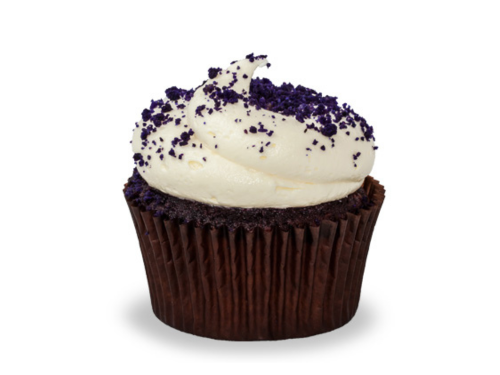 The Classic Cupcake Co. all time signature cupcake – A purple velvet sponge topped with our whipped white buttercream frosting & purple velvet cake crumbs.