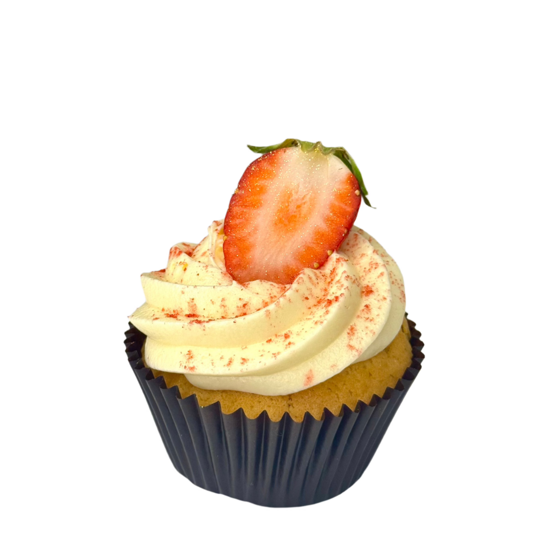 These delightful cupcakes are made of a soft vanilla sponge, topped with cream cheese frosting and a strawberry.