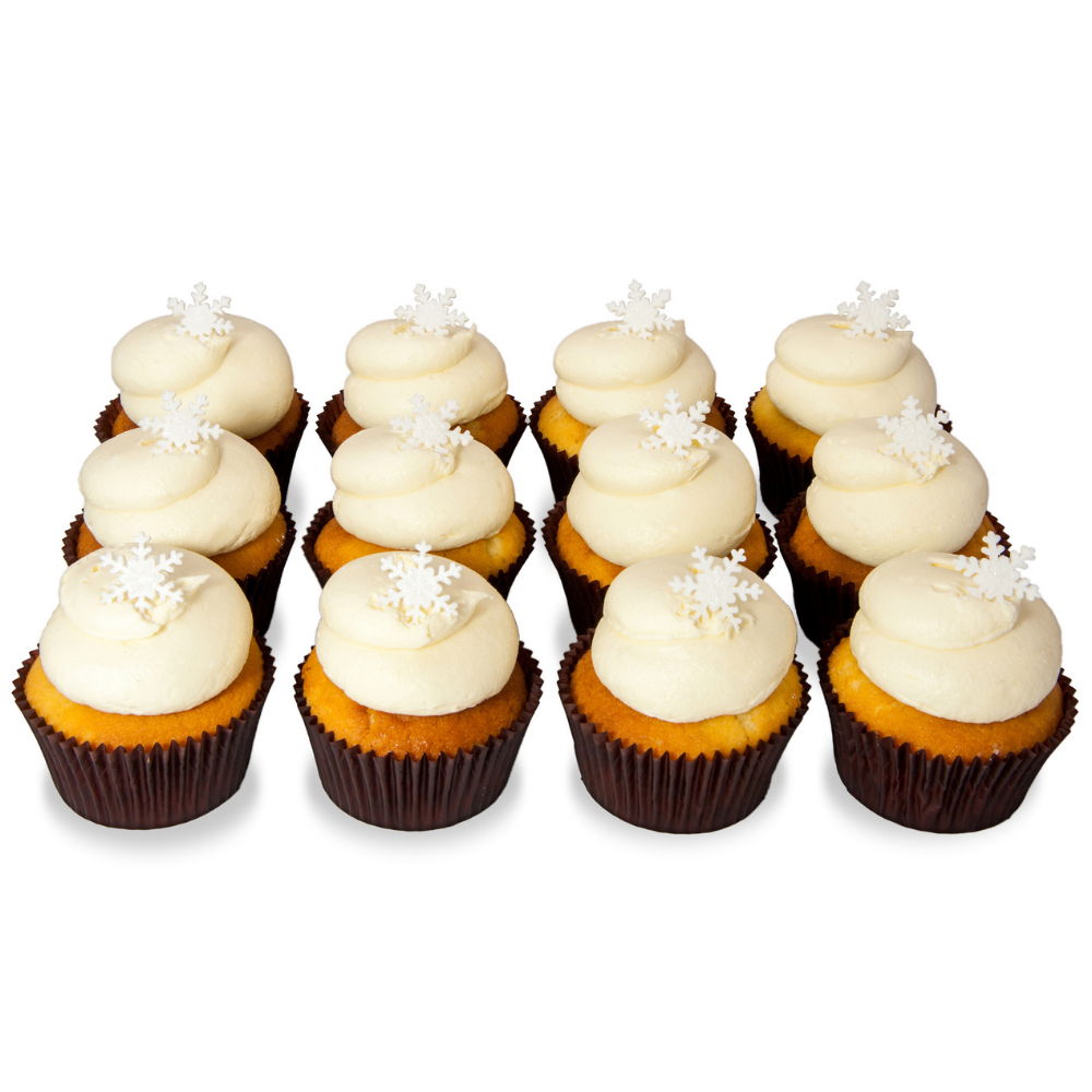 A light organic vanilla sponge topped with whipped buttercream frosting and delicate lustered white snowflake.