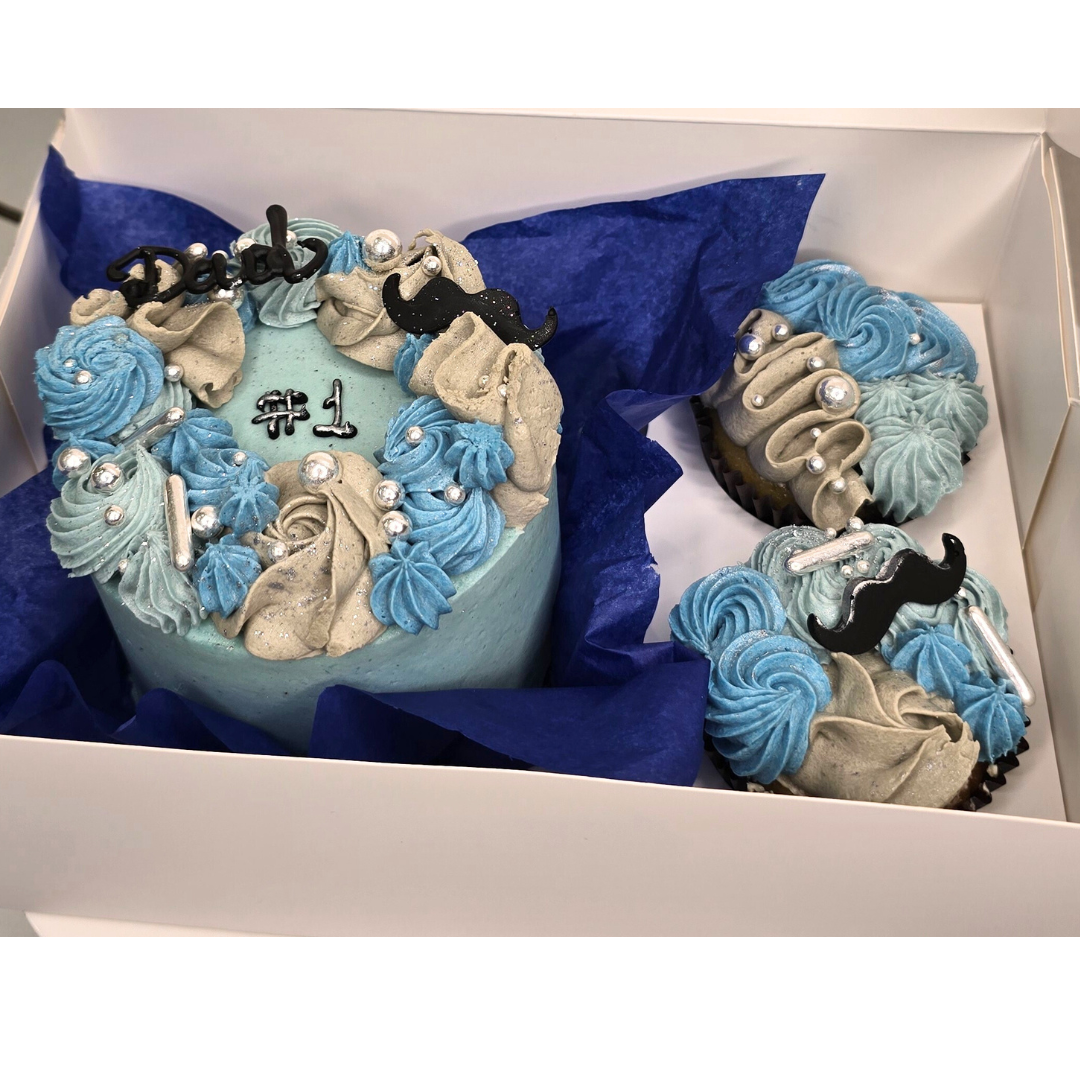 Celebrate Dad with the perfect mix of charm and flavour. Our Father’s Day Duo Box features a mini custom cake and two matching cupcakes, decorated in a bold blue-and-silver palette with playful moustache toppers and shimmering pearl accents.