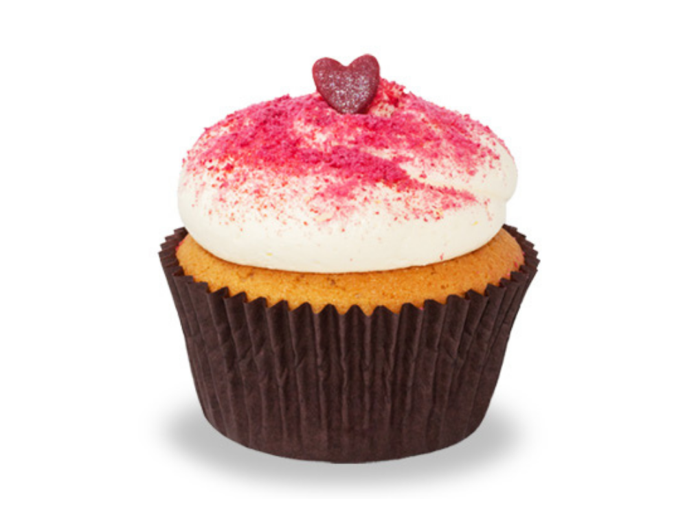 White chocolate and blitzed sweet cranberry cupcake with whipped white buttercream, freeze-dried cranberry dust & fondant red lustered heart.