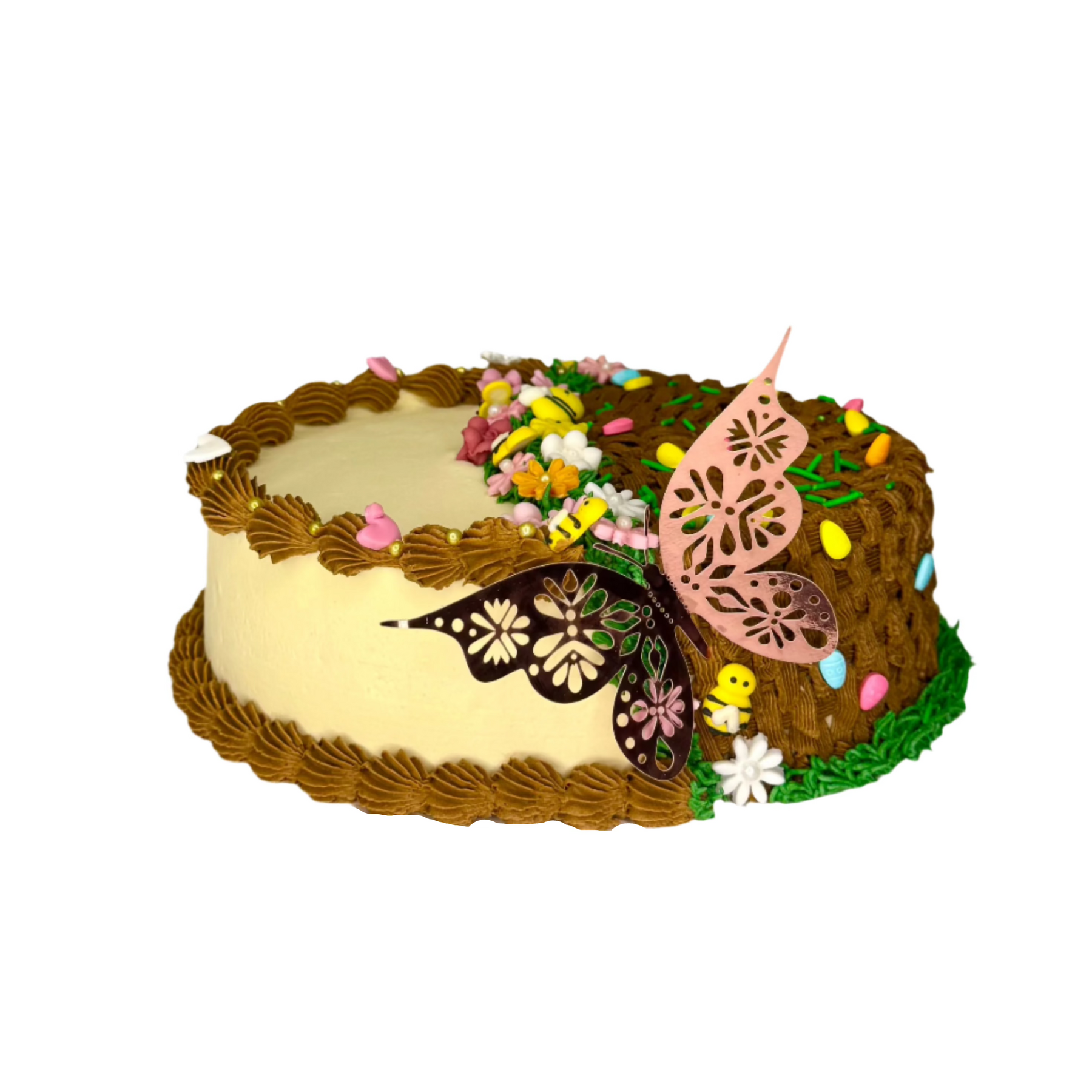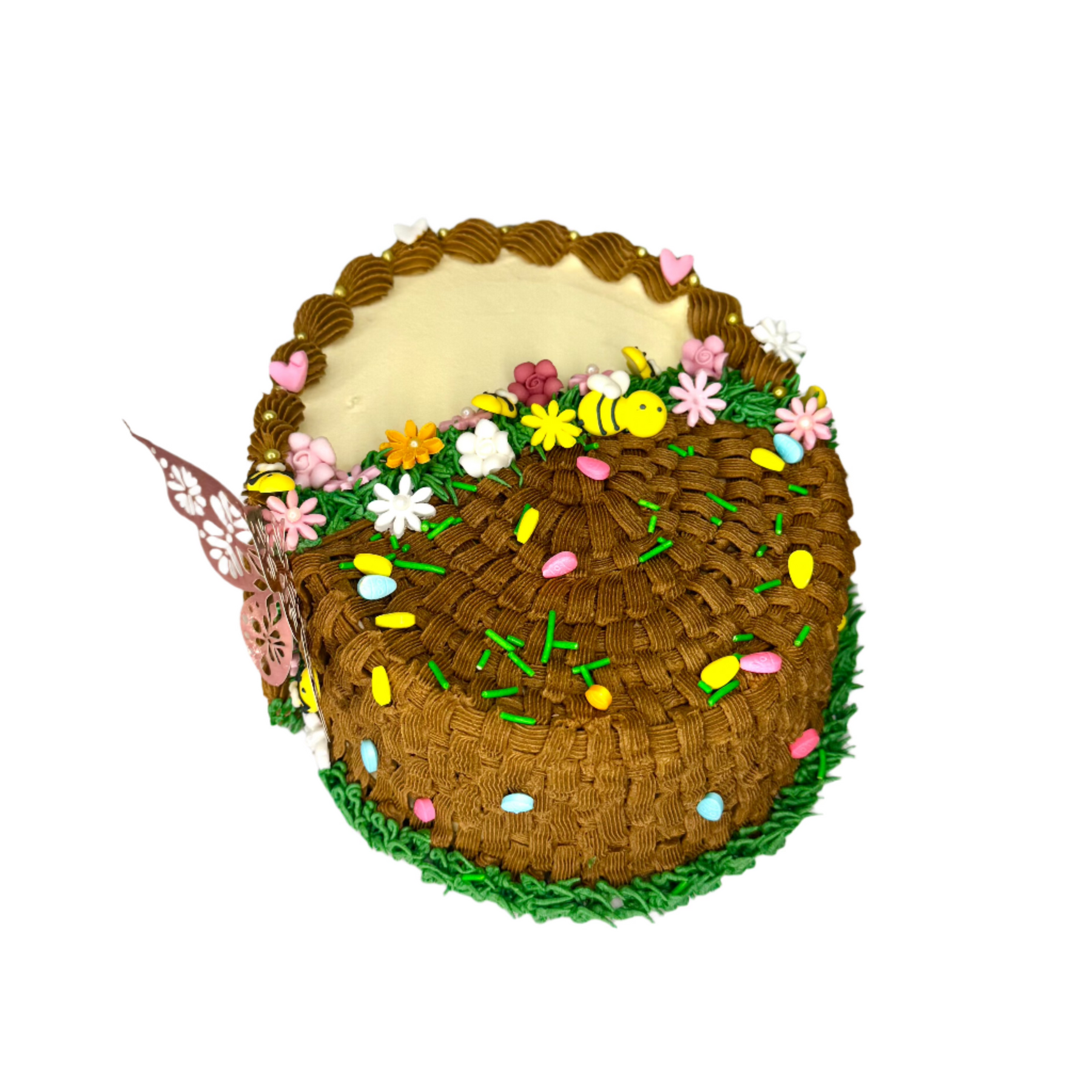 This delightful oversized egg-shaped cake, features layers of soft, fluffy cake, beautifully decorated with pastel-colored frosting and adorned with delicate spring flowers, charming little bees, and soft pastel details.