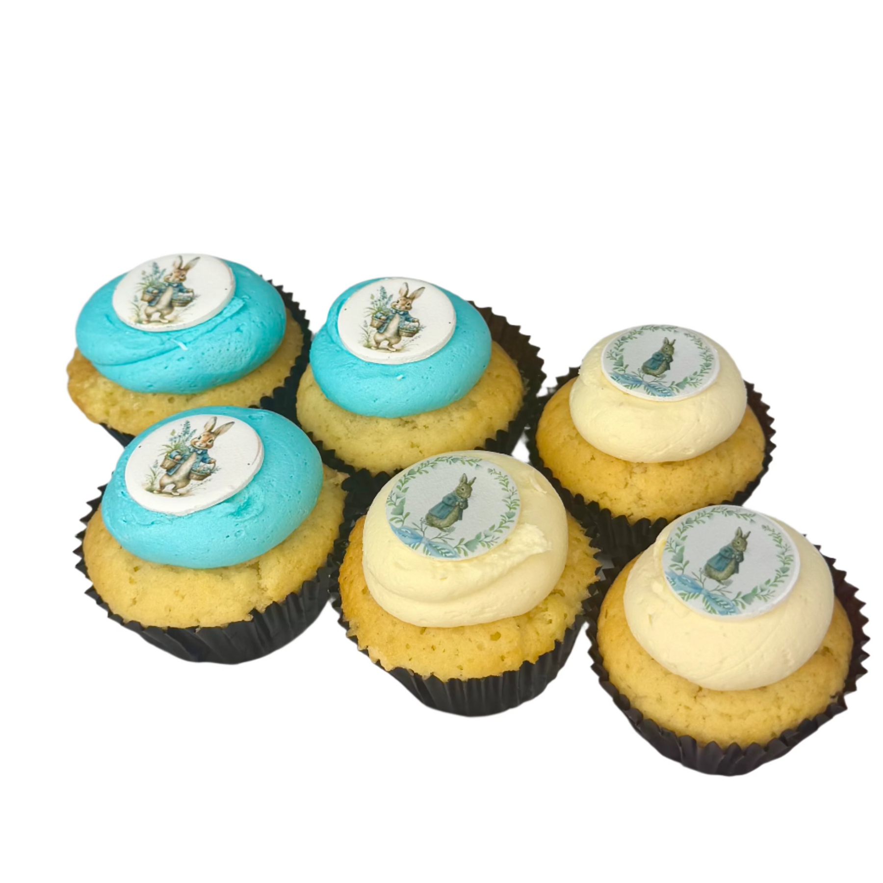 Hop into sweetness with our Peter Rabbit Cupcakes! These charming treats feature a moist base of your choice, topped with soft swirls of blue and white vanilla ganache, and finished with an adorable Peter Rabbit token.