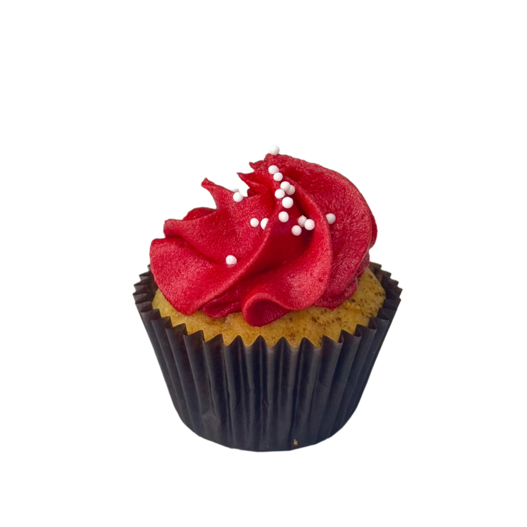 Comes in your choice of rich sponge, each topped with a swirl of smooth vanilla buttercream in a bold red hue.
