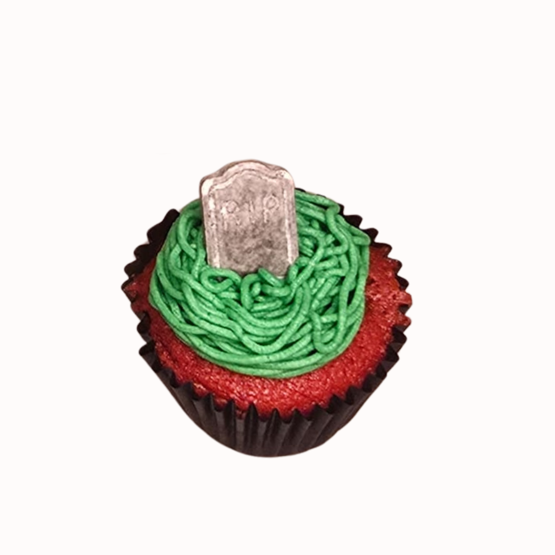 A hauntingly cute red velvet base topped with green “grass” frosting and a silver tombstone accent, this cupcake brings playful graveyard vibes to your dessert table. It’s the perfect sweet treat for trick-or-treat nights or eerie-themed gatherings.
